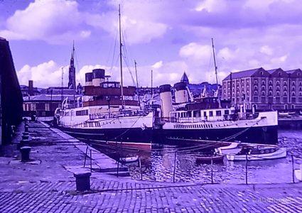 It was mostly the turbine ‘Duchesses’ that kept going down to Campbeltown and Ayr in bad weather (Ailsa Craig, which was non-landing, was usually cancelled quite readily in storms) but occasionally the paddlers went to the outer Firth too. Of course Caledonia, as the Ayr excursion steamer, operated there all the time, but she was only accessible to us when she came upriver on cruises. But I remember what fun it was crossing on Jeanie Deans from Brodick to Largs on a stormy day when nobody bothered to put dodgers on the paddle sponson openings. The waves were splashing in and the water was sloshing along the starboard engine room passageway so we schoolboys were able to get splashed by the spray and run through the water at the same time!