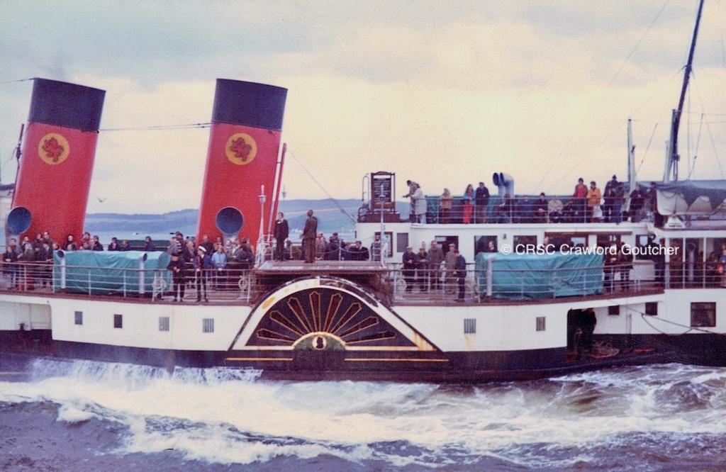 Don revealed that 1973 was the year when Waverley became something of a film star. In early August she featured in the BBC’s ‘Play Away’ starring musician Jonathan Cohen (a Waverley supporter and CRSC member to this day). On a mid August cruise to Tarbert she carried two banjo players who were filmed from a helicopter for ‘Clydescope’. And the day after the Paddle Steamer Preservation Society’s end-of-season ‘Five Lochs Cruise’ on 29 September, she circled the Firth between Gourock and Dunoon for a film for which Countess of Kempock (ex Breadalbane) served as ‘camera ship’.